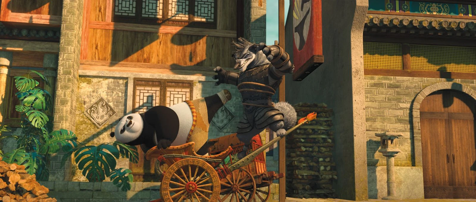 Po and Boss Wolf fighting on a moving rickshaw cart through Gongmen City