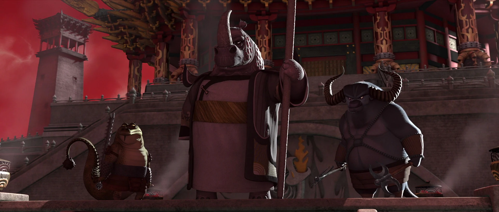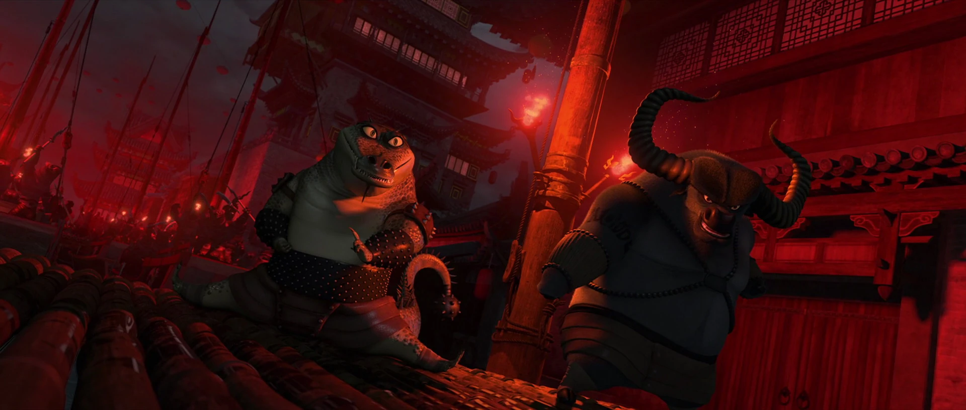 That evening, Croc and Ox were alerted to the sound of hundreds of wolves all over the city. When Po and the Five returned to the jail to hide, Croc and Ox demanded to know what they had done to cause this chaos, though they were ultimately ignored as Tigress confronted Po over his letting Shen escape. When Po refused to answer, Tigress decided to leave him in the jail, where Croc and Ox said they would keep him far from danger. Croc and Ox witnessed the sparring match that followed, and the former visibly winced as Po was subdued. Po eventually revealed the truth, and though empathetic, Tigress told him to stay behind anyway and soon left with the Five. As the Five left, Croc and Ox attempted to reassure Po that he would be alright in the jail, but it is unknown how they reacted when Po went after Shen anyway.