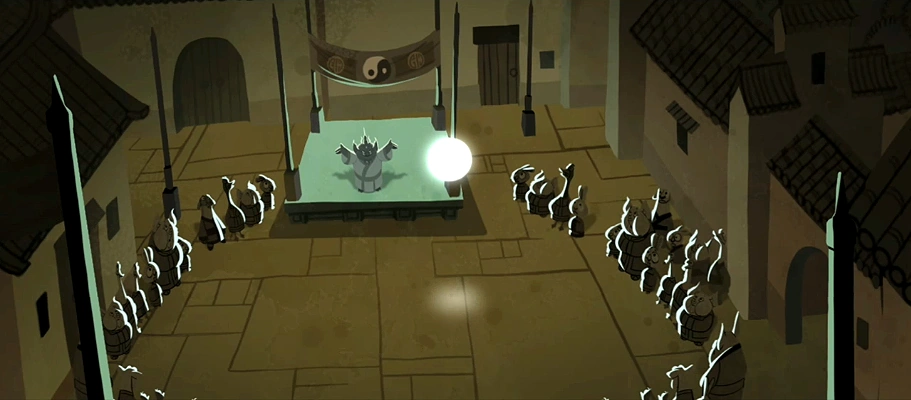 Ding used to be a kung fu student who had a mental focus unlike any other. Oogway saw his talent in magic arts and sent him to study with some monks atop of Mugu Mountain, but Ding was impatient and turned on his teachers, hypnotizing them with his spirit orbs and using pure focus to drive them to their demise by making them jump off a cliff. Ding began mentally attacking people with his orbs, but before he could control the Valley of Peace, the Jade Palace masters ended his reign of terror. They imprisoned him in a castle on the mountain for life. Soon afterwards the orbs were confiscated and were locked up in the Jade Palace. Without the orbs, Ding was powerless and according to legend after passing away, his ghost is still trapped inside the castle. Years passed and Ding was forgotten.[1]