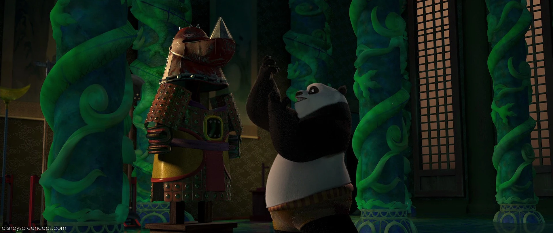 While Po was gawking at all the historical artifacts on display in the Hall of Warriors, he immediately recognized Flying Rhino's armor, commenting on its "authentic battle damage" (referring to the scratches).