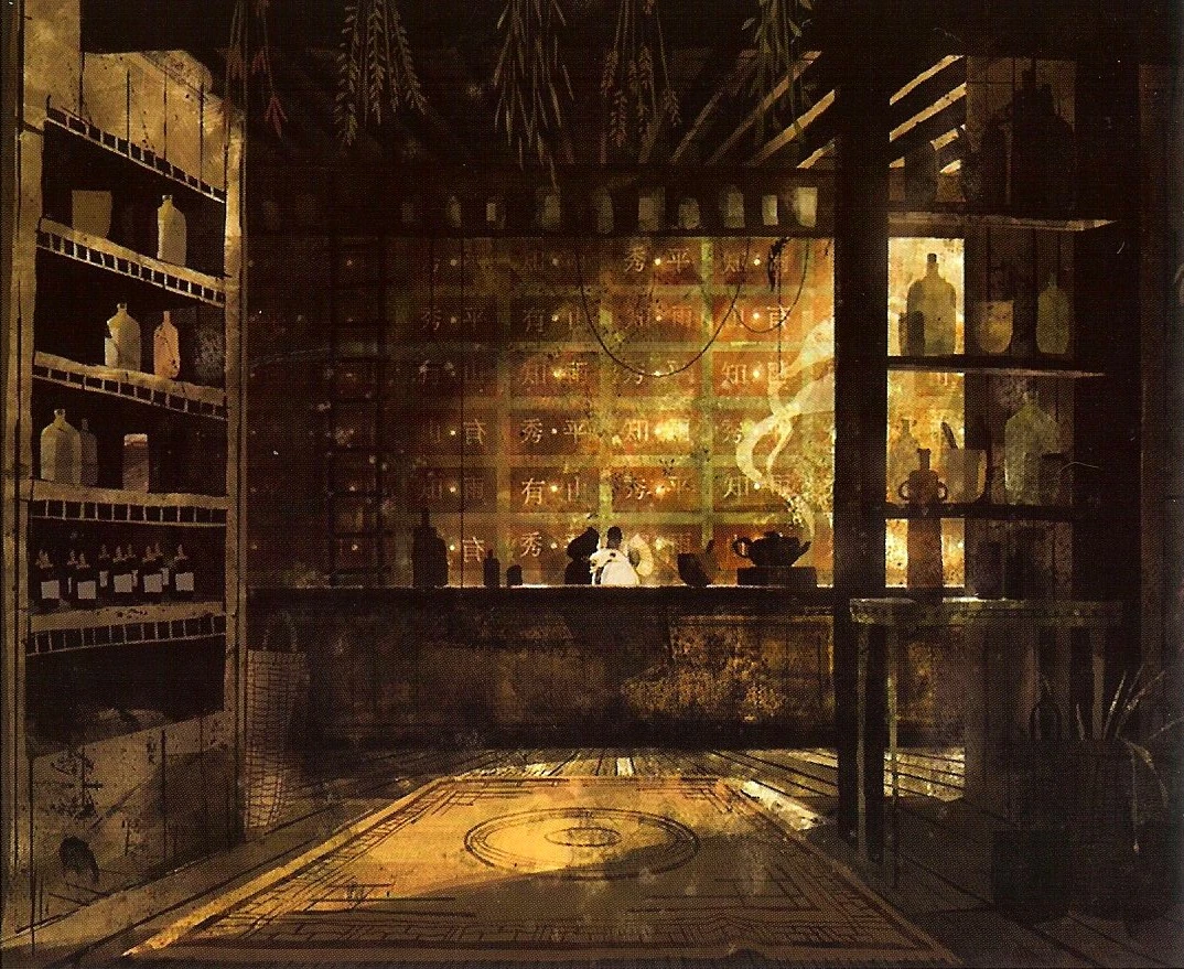 - Head of story Phil Craven explained how one of the original concepts for this location was instead an underground kung fu training club, disguised to look like a medicine shop (or also a tea house from one of the concept pictures) at the ground level. This came from one of their early story concepts of there being a ban on kung fu in the city.[1]