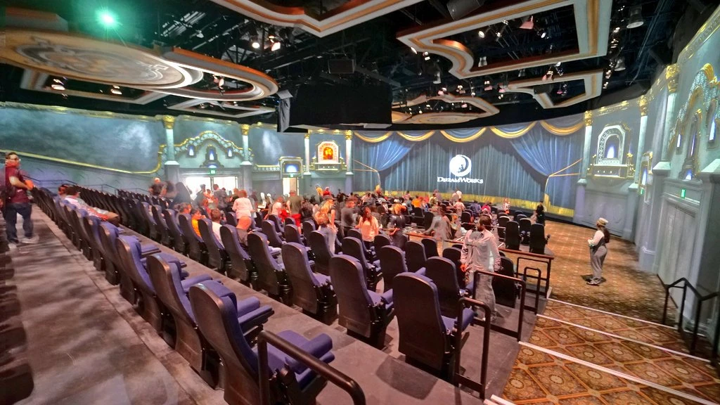 Prior to the main ride, guests enter a "pre-show area of the theatre where they meet an array of DreamWorks characters who kick-off the attraction's narrative." They then move to the main ride theatre.[2]
