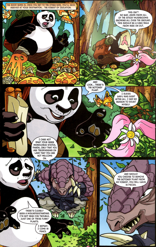 After a long journey through many dangerous hazardous locations, Po finally reached the Forest of Isolation, which was full of sticky mushrooms. Po quickly discovered the botongy plant, but was confronted by the Chinese Pangolin, the guardian of the forest. In reference to the Pangolin's claims that the greatest offense is a defense, his body was covered in plates, making physical blows useless and painful. However, Po persisted, striking the Pangolin all over while drenching him in sticky mushroom goop. The arrogant Pangolin stood completely still during this, and questioned Po over his apparently futile attempts. Po explained that he had no intention of letting Tigress down, and that his blows were meant to disguise his true intentions; the Pangolin then grew aware that the sticky mushrooms in his plates had immobilized him. After commenting that the greatest offense was actually the ability to problem solve, Po departed with the botongy plant.