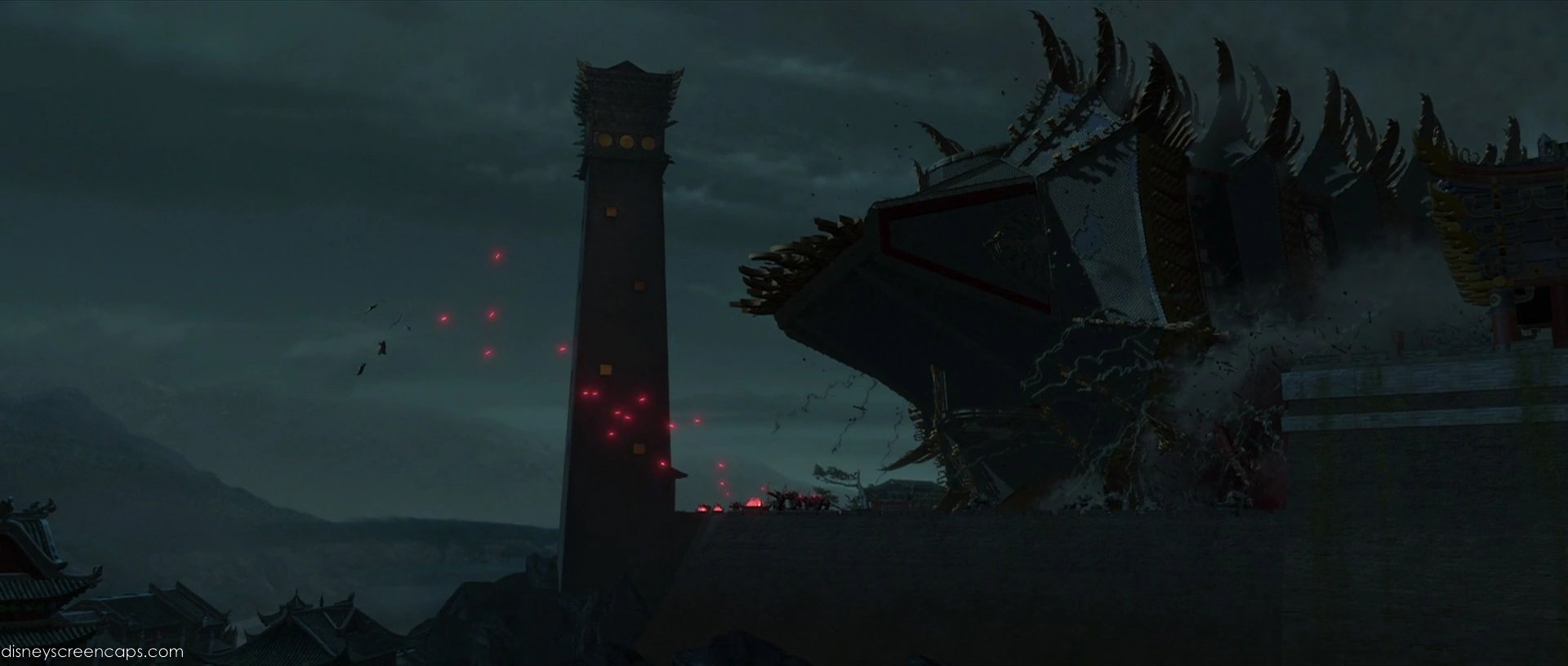 The Tower of the Sacred Flame was a walled-off palace in Gongmen City that was heavily protected by four watchtowers, cannons, and countless guards. It served as the ancestral home of the Peacock clan, whose descendant and heir to its throne, Lord Shen, forcibly took over and eventually destroyed it after being banished in Kung Fu Panda 2.